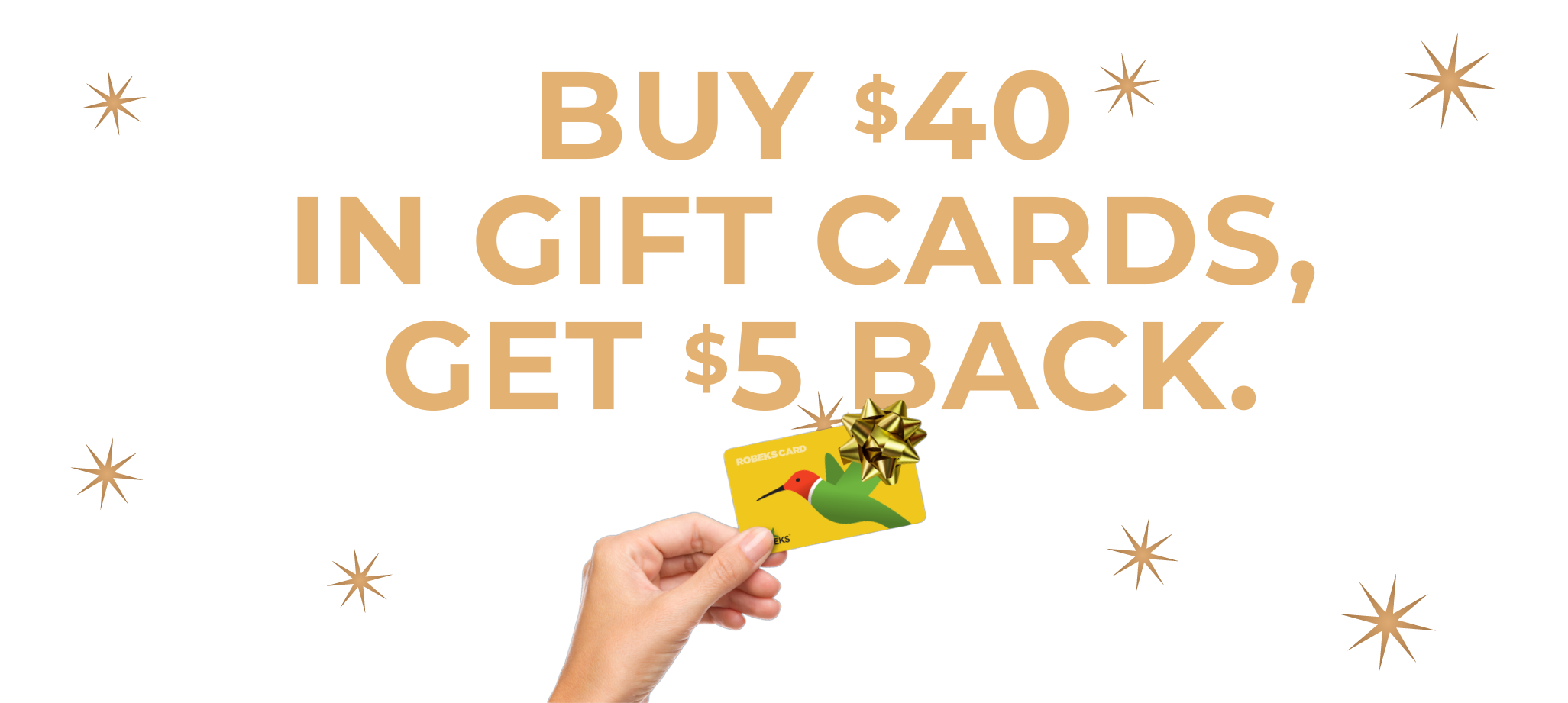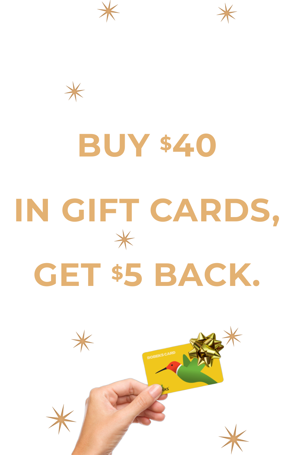 Starting 11/17/25 through 12/31/25 each purchase of $40 in gift cards under one transaction and under one order number will entitle the purchaser to one (1) $5 scratch-off card or $5 digital voucher. In-store, this purchase can be made up of multiple lower-denominated gift cards and as long as the order total is at least $40. It is possible to qualify for multiple Reward Codes, one (1) will be provided for each $40 spent under one transaction and under one order number. For gift card purchases made through the Robeks Rewards app, the applicable number of $5 digital vouchers will be automatically added to the guest account for each qualifying gift card purchase.